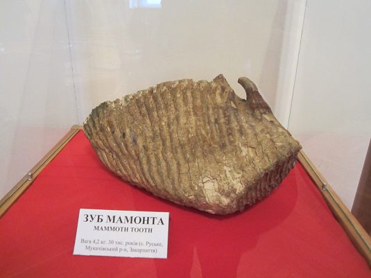 У той самий час на території Мукачівського району, а саме у селі Руське, археологи знайшли зуб мамонта. Вага знахідки перевищує чотири кілограми, а вік становить приблизно тридцять тисяч років. Цей артефакт свідчить про те, що на теренах Закарпатської області мешкали мамонти.